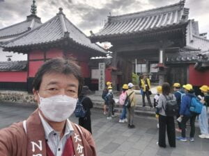 午前8時50分に南部小学校を出発し、丸善かまぼこや寺町の赤壁やかっぱ寺、閻魔寺、大江医家資料館、豊後町の町並み、福沢旧居、歴史博物館、木村記念美術館を巡りました。