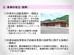 条例の改正では、中津市公民館条例の一部改正や中津市病院事業及び診療所事業の設置等に関する条例の一部改正が可決されました。