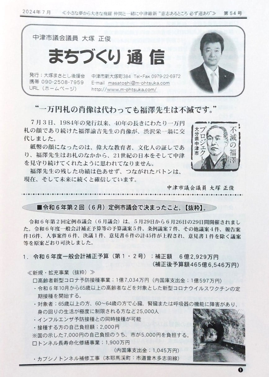 議会まちづくり通信第54号が出来上がりました。2024.07.05 おはようございます。中津市議会議員の大塚正俊です。昨日、6月議会の概要をまとめた「まちづくり通信第54号」の印刷が出来上がりました。早速、事業所等に配付を行いました。通信には、今議会で議決した補正予算や条例議案、一般質問等の内容を掲載しています。印刷物は白黒ですが、ホームページではカラー版をご覧いただけます。左の画僧をクリックしてください。今日は、地元を中心に配付の予定ですが、暑さとの勝負になりそうです。 Post Share RSS 議会一万円札の肖像は代わっても福澤先生は不滅です。庭の畑のパプリカを初収穫しました。