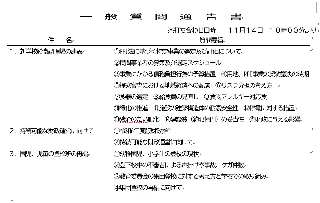今回の一般質問は、①新学校給食調理場の建設、②持続可能な財政運営に向けて、③園児、児童の登校班の再編の3点について執行部の考え方を質します。