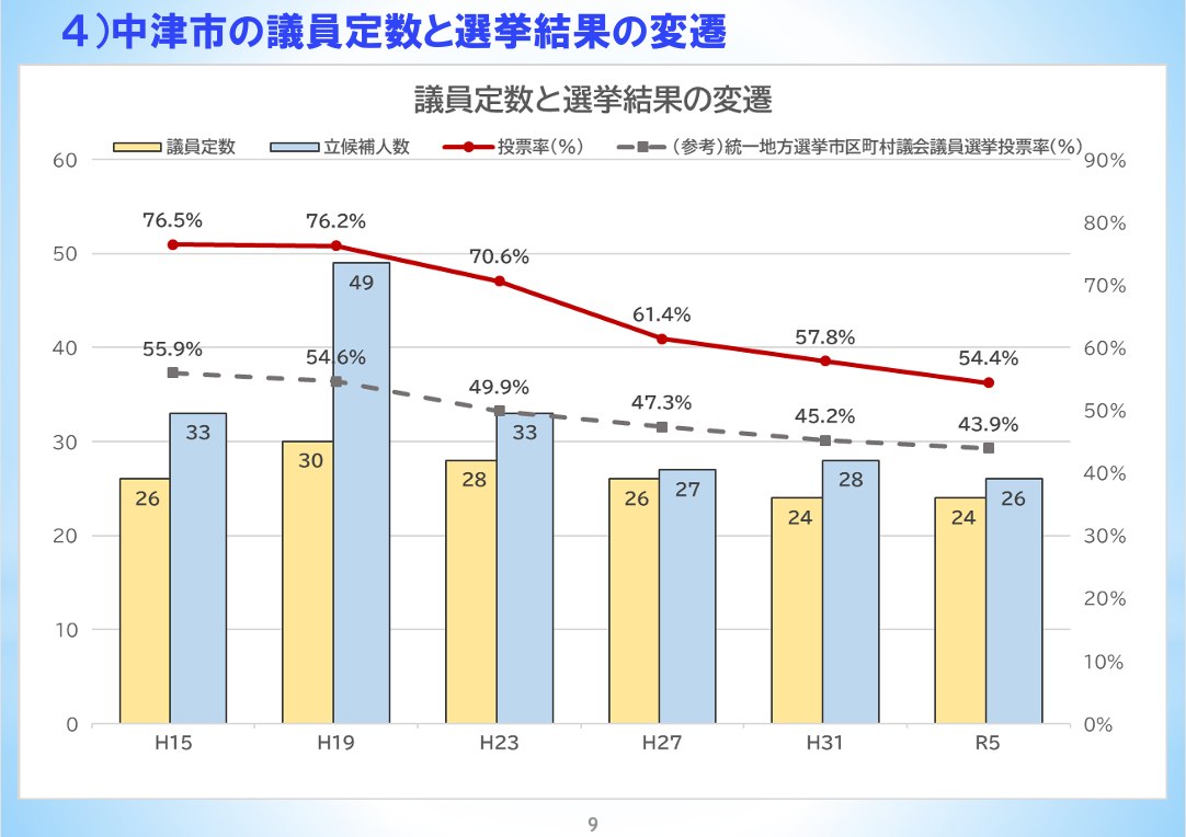 ◇これ以上議員を減らすと旧下毛町村に在住する議員がいなくなる可能性がある。(現在、山国町在住議員が不在)住民の声を出来るだけ市政に反映させるためには、議員をもっと増やすべき。議員はもっと議会・議員活動に切磋琢磨すべき。全国的に議員数削減や報酬の見直しが行われているが、中津市にとって必要な議員数の確保、報酬の引上げを行うべきでは。
