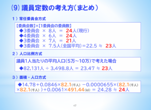 特別委員会では、これまで9回にわたる会議や有識者を招いての議員研修会を開催するなど、地方分権時代における適正な議員定数について議論してきました。