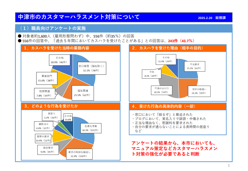中津市においても、本年2月に公表された「職員向けアンケート」結果では、「過去5年間においてカスハラを受けたことがある」が243件(43.7%)との調査結果が明らかとなりました。