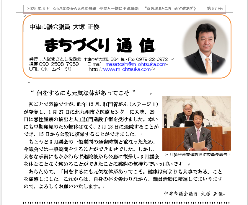 さて、私ごとで恐縮ですが、昨年12月、肛門管がん(ステージ1)が発覚し、1月27日に北九州市立医療センターに入院、29日に悪性腫瘍の摘出と人工肛門造設手術を受けました。幸いにも早期発見のため転移はなく、2月13日に退院することができ、15日から公務に復帰することができました。