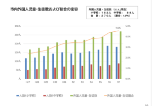 また、「子育て教育環境の充実」を重点施策に掲げ、「多様な文化や慣習などをはじめとした理解と人権意識を深め、お互いを尊重し合う多文化共生や異文化理解の視点に立った教育」を推進しています。外国人の児童生徒が増加傾向にあり、指導員(支援員)の増員によるきめ細やかな学習支援や家庭支援を実施すべきと考えます。