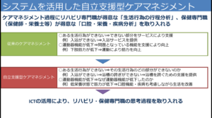 フレイル予防対策に向けて、従来の「支援による自立(デイサービスで入浴、ヘルパーが、食事の用意)」から「自立を支援(入浴できるように支援、食事の用意ができるよう支援)」するケアマネジメントへの転換が必要であり、早期にこのシステムの導入を検討すべきと考えます。