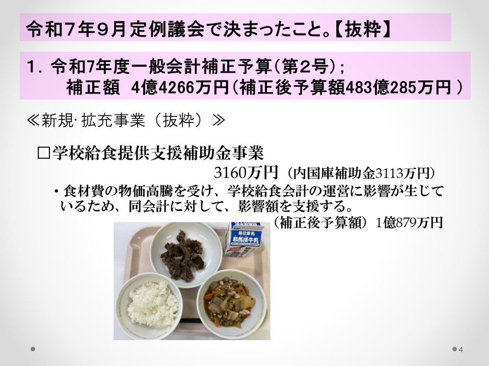 9月議会では、令和6年度一般会計決算の認定等決算議案9件、令和7年度一般会計補正予算等の予算議案5件、条例議案6件、人事案件2件、その他議案5件、報告案件7件、請願2件の計36件が上程され、請願2件以外の議案を原案どおり可決しました。