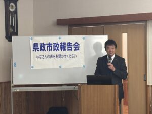 吉村県議から9月県議会の概要、千木良・木佐貫市議から9月市議会の概要の報告の後、9月議会の私の一般質問の概要を報告させていただきました。