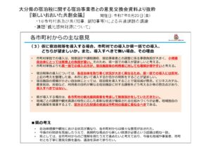 (質問)「大分県が宿泊税を課税するなら良し」とするのではなく、中津市も第3者機関を設置して、宿泊税に関する調査検討をすべきではないか。