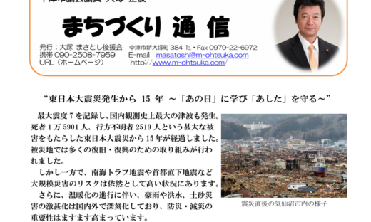 議会 まちづくり通信第60号を地元に配付しました。 2026.01.10 おはようございます。中津市議会議員の大塚正俊です。 昨日、12月議会の概要をまとめた「まちづくり通信第60号」を地元新大塚町の各戸に配付しました。 約300件の家を4時間かけて回りました。 朝は手がかじかむほどの寒さでしたが、1時間もすると途中でジャンバーを脱ぐほど暖かくなりました。 これで、ようやく僕の12月議会が終了しました。 後援会の皆様方には、13日、14日に届くと思います。 まちづくり通信第60号は、左の画像をクリックするとPDFでご覧いただけます。 Post Share LINE RSS note 議会 蛎瀬川にたくさんのカモが泳いでいます。 中津市の少子化が急激に進んでいます。