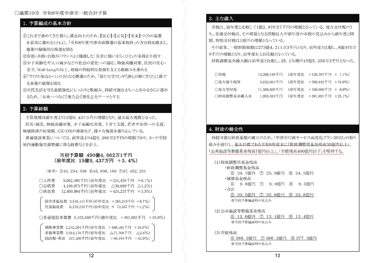 令和8年度当初予算編成においては、「未来へつなぐ『地力』と『進化』」をテーマに、防災・減災、物価高騰対策、少子高齢化対策、子育て支援、若者や女性への支援、地域経済の好循環、GX・DXの推進など、様々な施策を盛り込んだとのことです。