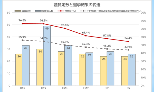 今回の市全体の投票率は、過去最低の54.39%でした。毎回、投票率が低下しています。