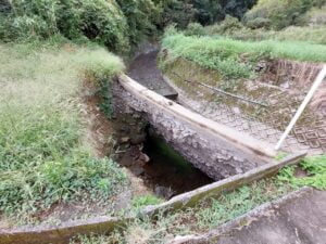 山国町草本の辻川では、擁壁の内側が洗堀されて浮いた状態になっています。