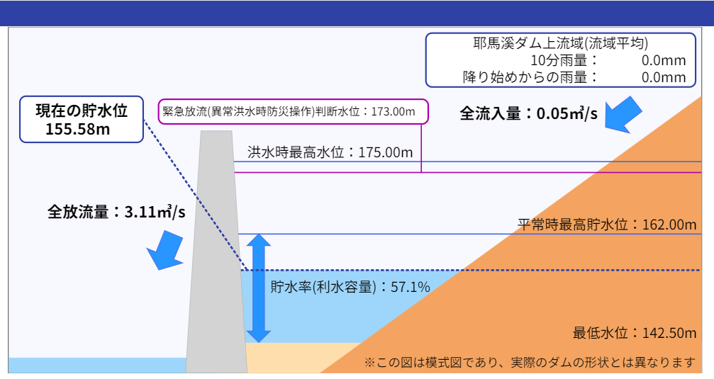 ダムへの流入量が0.05㎥/s、放流量が3.11㎥/sで、3.06㎥/s減少しています。1日当たり264,384㎥減る計算となります。
