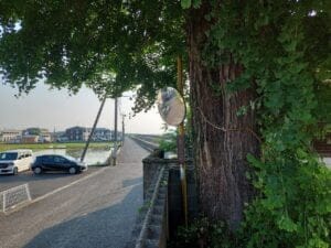 さて、家の前の八社神社の丁字路交差点のカーブミラーの支障枝を切りました。