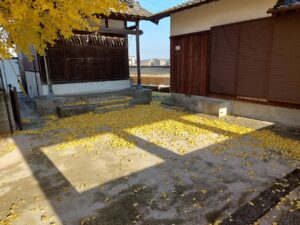 風にあおられイチョウの葉っぱが落葉し、黄金色の絨毯ができています。