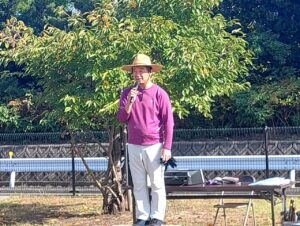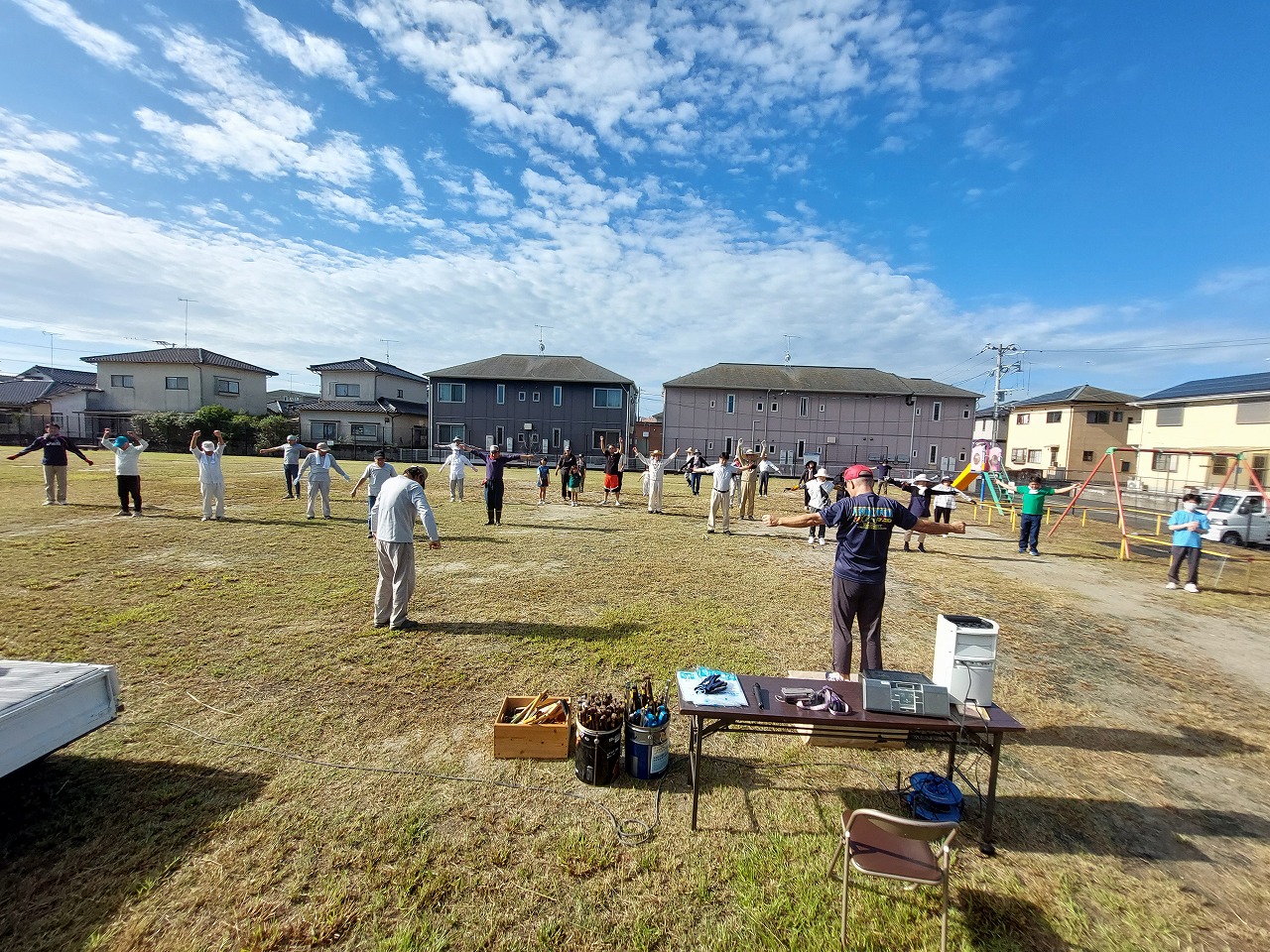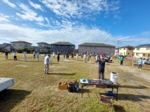 開会行事で作業の注意事項等の説明をした後、ラジオ体操で体をほぐしました。