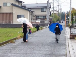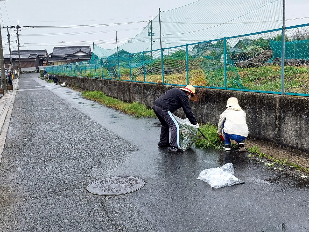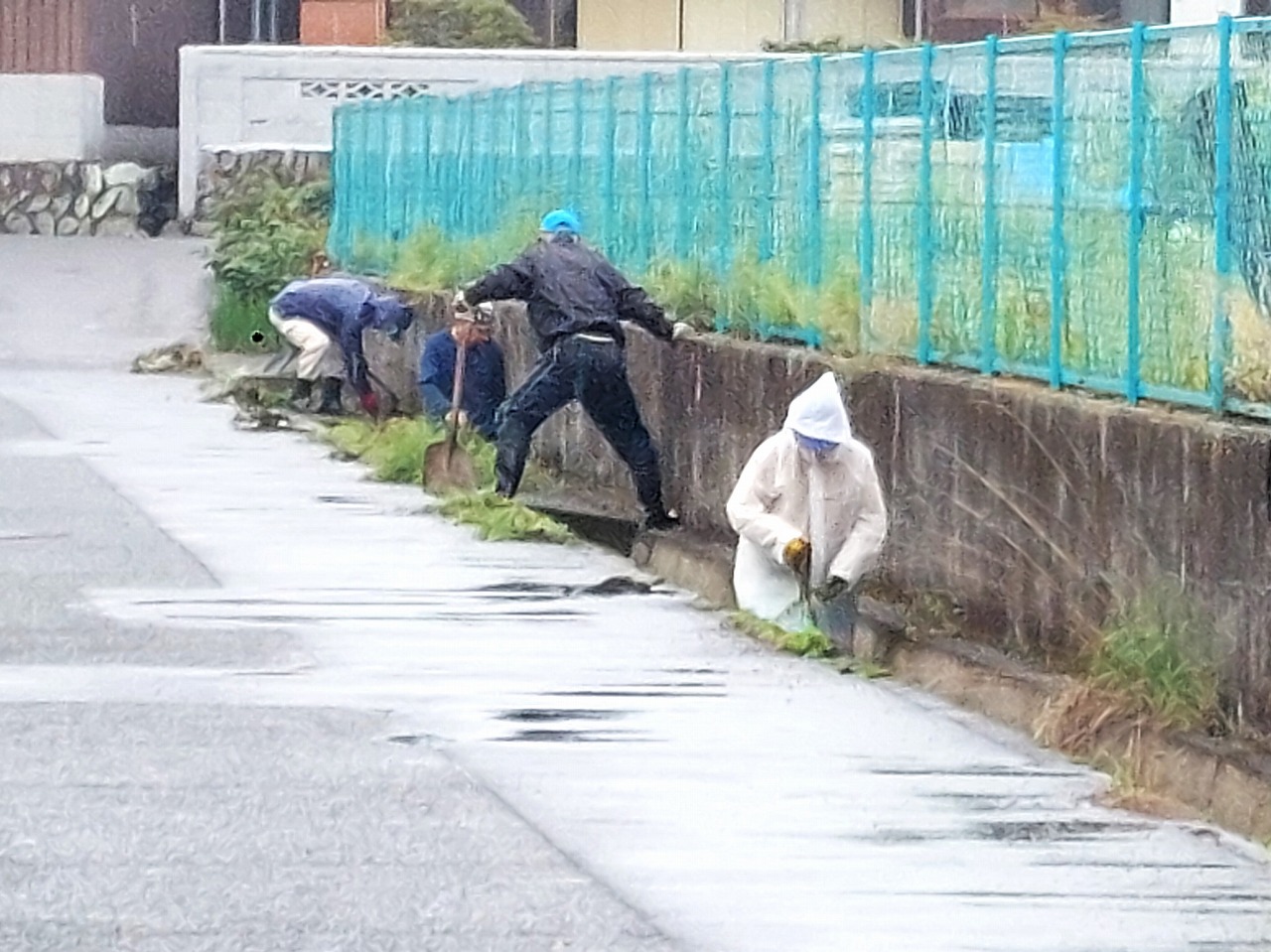 小雨が降る中、担当エリアの水路の泥上げと草刈り、ごみ拾いをしました。