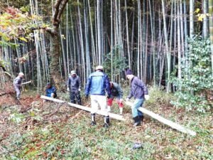 朝8時に、三光真坂に竹きりに行き、加工して部材を作りました。