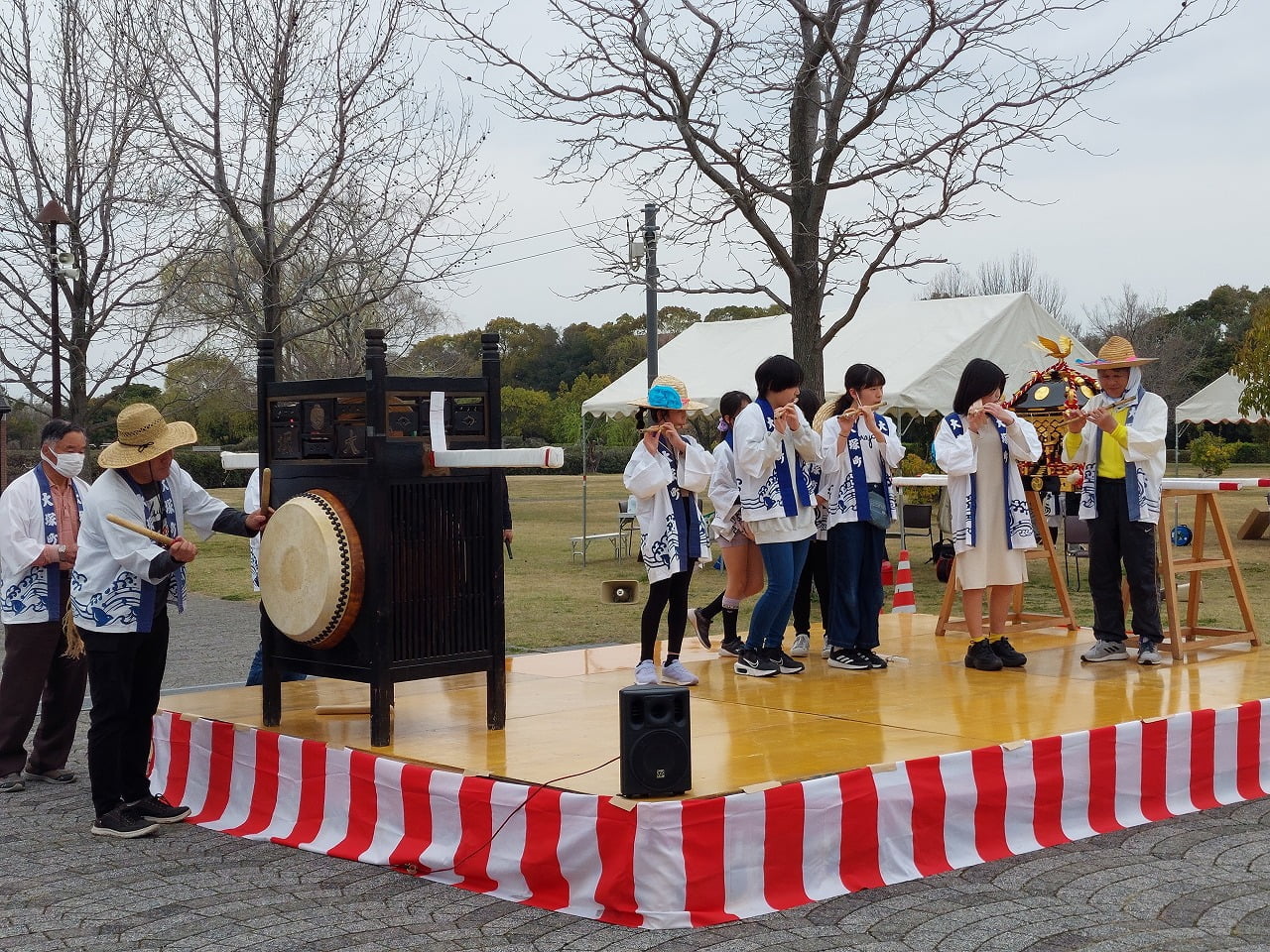 北部校区の中津祇園や傘鉾祭りのお囃子の競演や豊前蛎瀬神楽の舞いが披露されました。