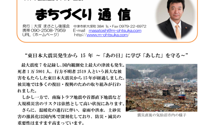おはようございます。中津市議会議員の大塚正俊です。 3月議会の一般質問通告書を提出して、一般質問の順番が決定しました。 6番目に登壇することとなり、...