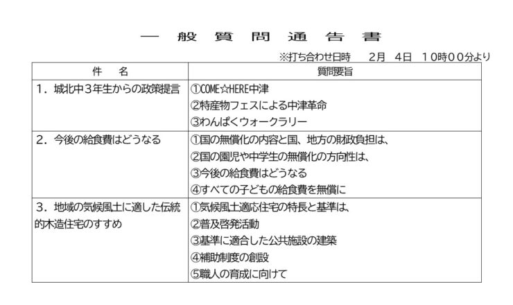 おはようございます。中津市議会議員の大塚正俊です。 3月議会の一般質問通告書を提出して、一般質問の順番が決定しました。 6番目に登壇することとなり、...