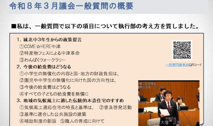 おはようございます。中津市議会議員の大塚正俊です。 昨日、令和8年3月議会の一般質問(2日目)が行われ、5名の議員から市政の抱える課題等について政策...