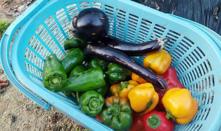 庭の畑のピーマン、パプリカ、ナスを収穫しました。