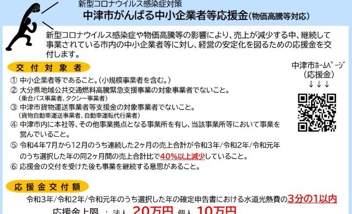 中津市がんばる中小企業者等応援金(物価高騰等対応)の受付開始