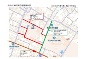 以前から、北部小学校周辺道路は、時間帯によって車両の進入禁止の規制がかかっていましたが、あらためて学校周辺を歩いて、交通規制の現状を探査しました。