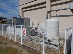 2021年10月に空調が整備された中津東体育館には、電源自立型HPH2基と災害対応バルグ1基、室内機が8台設置されています。停電時でも稼働できるようにLPガス空調を採用し、炊き出しや空調のほか照明や充電などに利用できます。