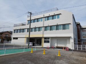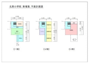 工事費は2億4000万円、1階に配膳室、下駄箱、2階に普通教室3室、3階に図書室が配置されました。
