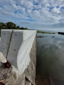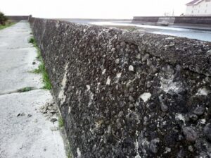 昭和30年代に整備された堤防で、コンクリートが朽ちて石がもろぼろと剥がれる状態でした。