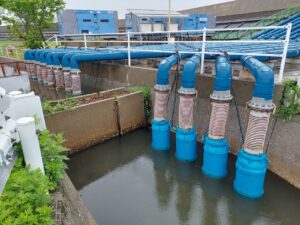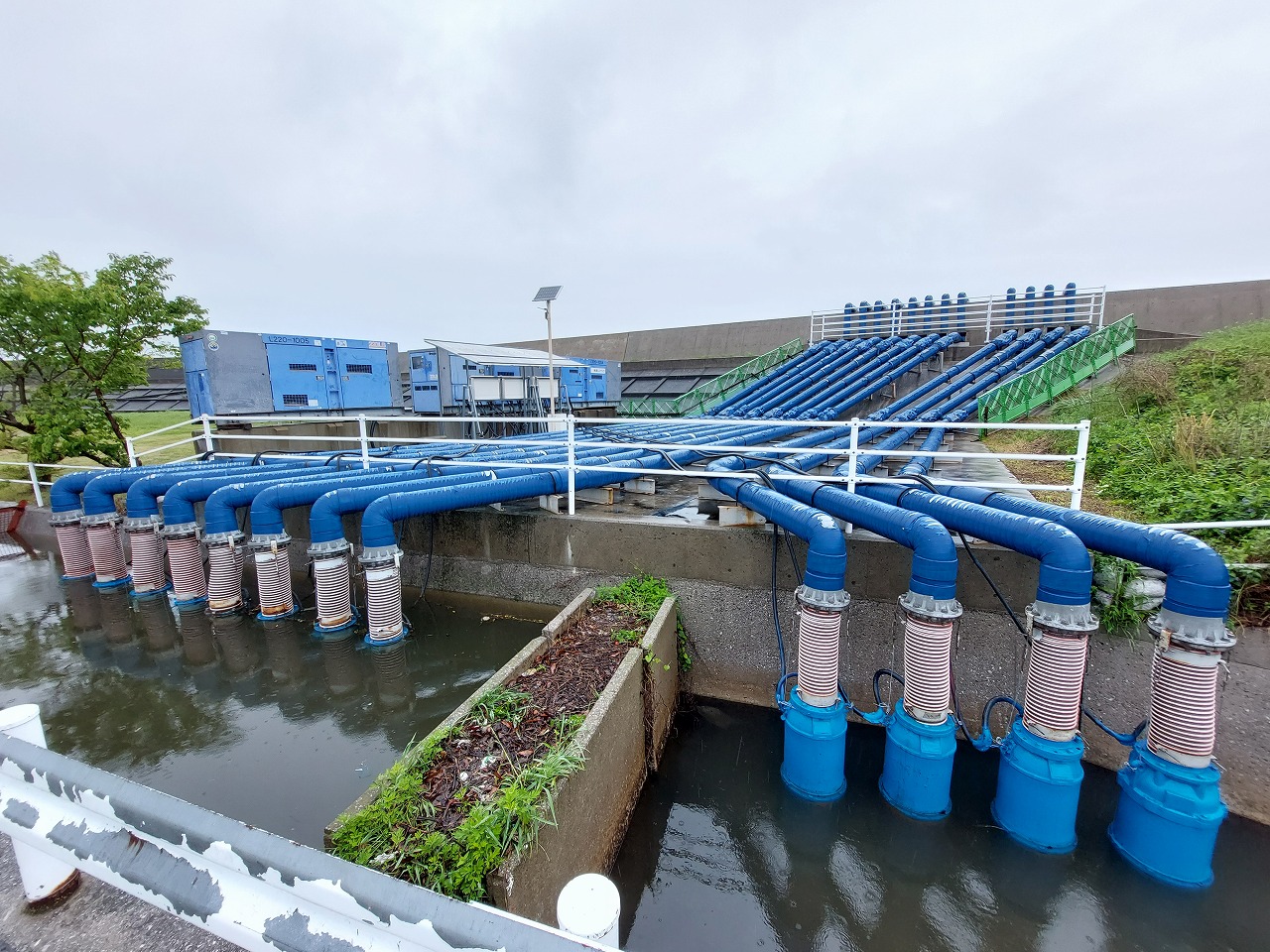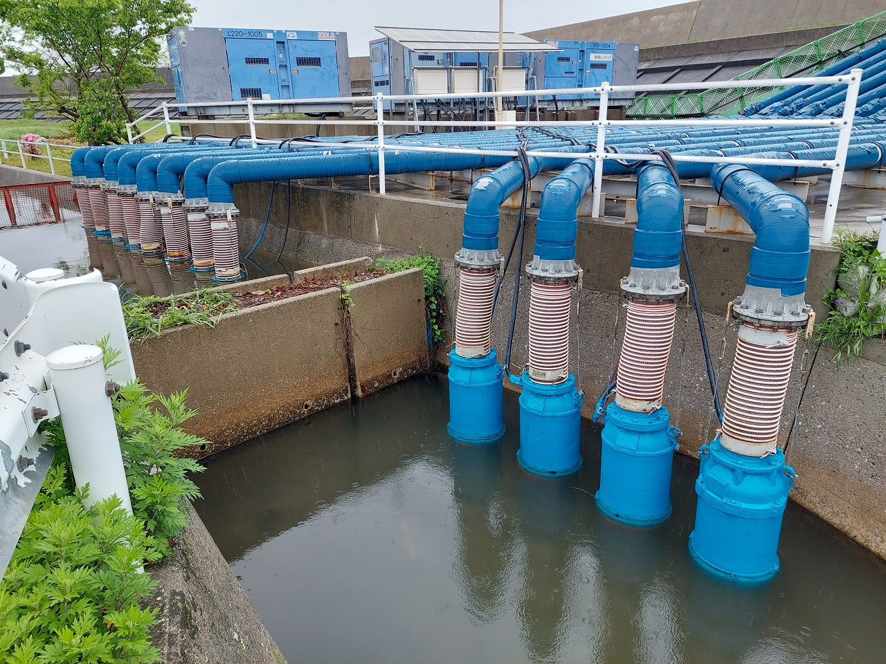 地元の角木・新大塚仮設ポンプ場は総排水量1.6㎥/秒が設置されています。配水管は常設ですが、毎年4月下旬から10月までの間、自家発電機3台と水中ポンプ12台が取り付けられます。
