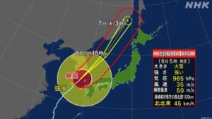 今朝5時現在、大型で強い台風11号が接近中です。今のところ強い風は吹いていませんが、予想進路ではあとわずかで最接近の予報です。