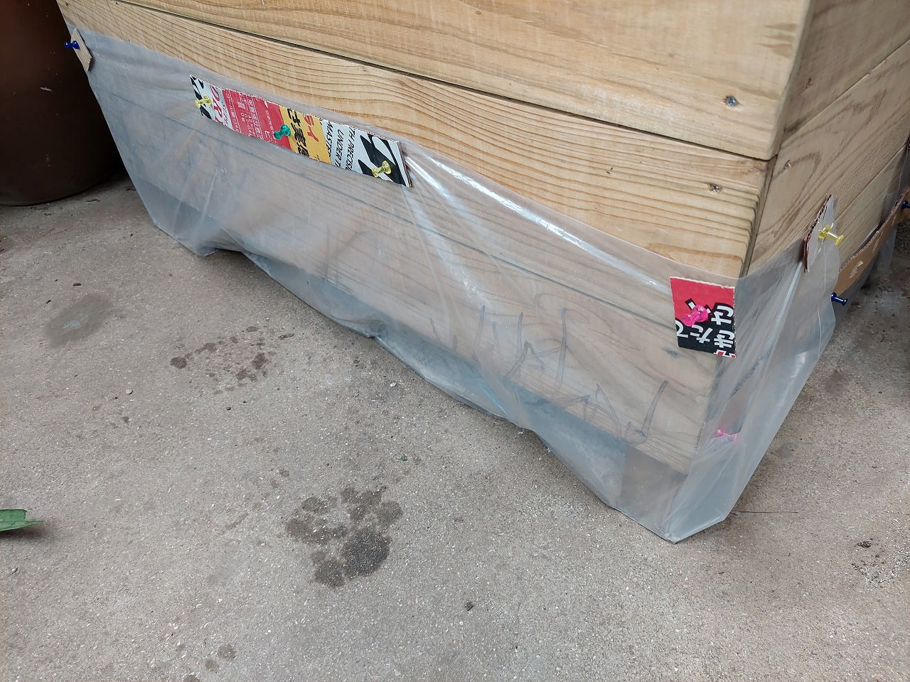 どうもキエーロの底からはい出てくるようなので、箱の底をごみ袋で覆ってみました。ごみ袋の床には、消石灰をまいて撃退します。
