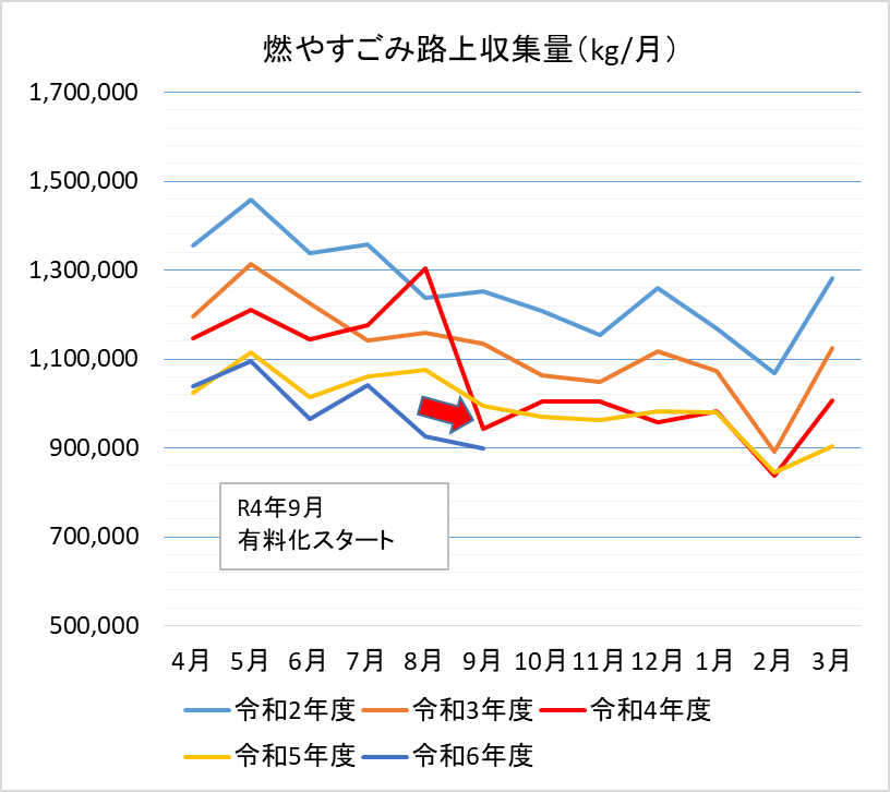 令和2年より燃やすごみの減量が続いていましたが、昨年12月からはほぼ前年と同量となり心配していましたが、6月から減量傾向となっています。
