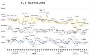 12月との比較では、資源プラとペットボトルが増加し、燃えないごみと燃やすごみ、古紙、びん・缶古布が減少しています。