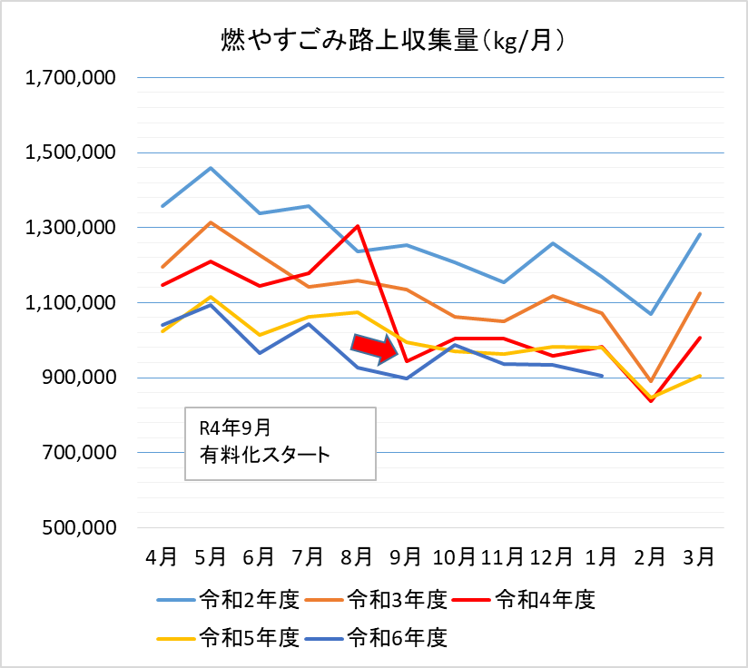 月ごとではごみ減量の効果分析が難しいため、長期的なスパンで見るために新たにグラフを作成しました。