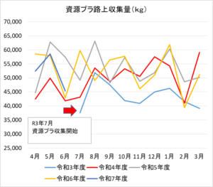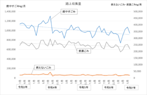 月ごとではごみ減量の効果分析が難しいため、長期的なスパンで見るためにグラフを作成しました。