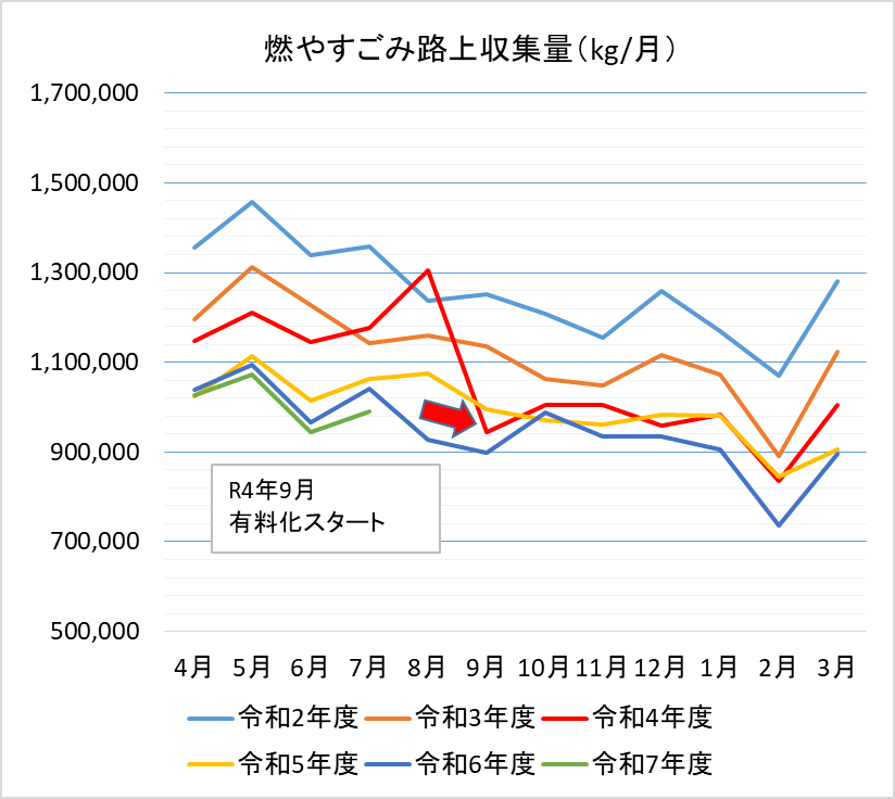 月ごとではごみ減量の効果分析が難しいため、長期的なスパンで見るためにグラフを作成しました。