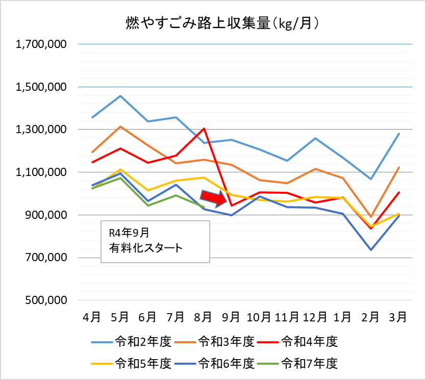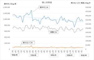 月ごとではごみ減量の効果分析が難しいため、長期的なスパンで見るためにグラフを作成しました。