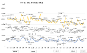さて、中津市の「ごみ収集(路上収集)」の8月分がホームページに公表されたので、市のデータをグラフにしてみました。