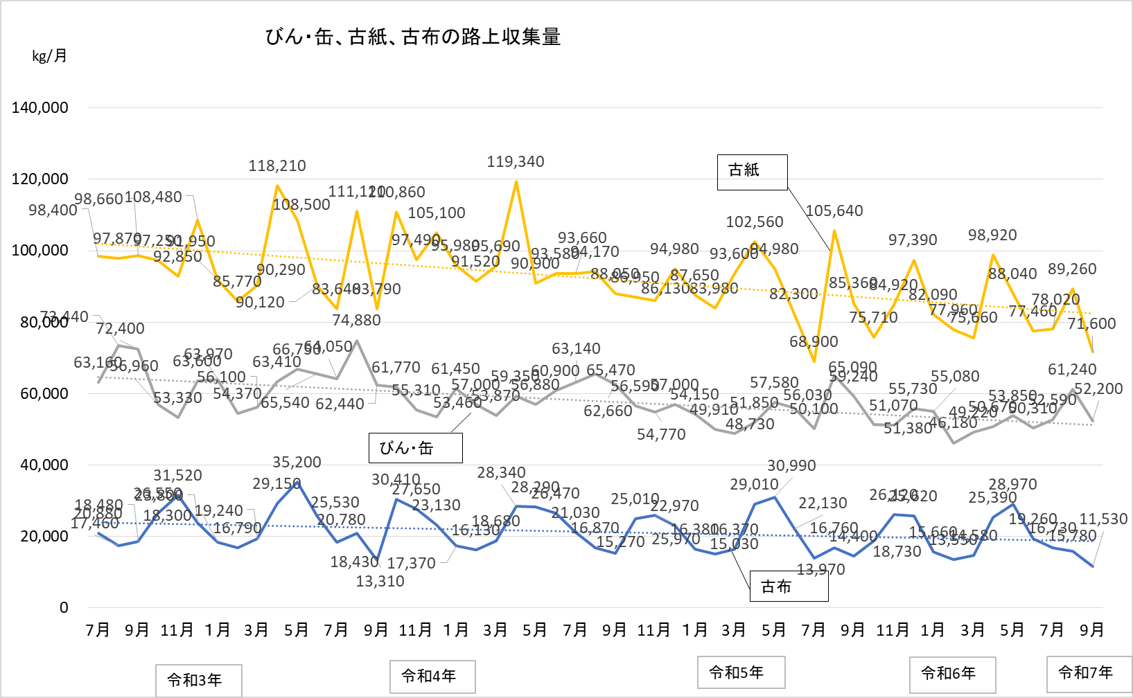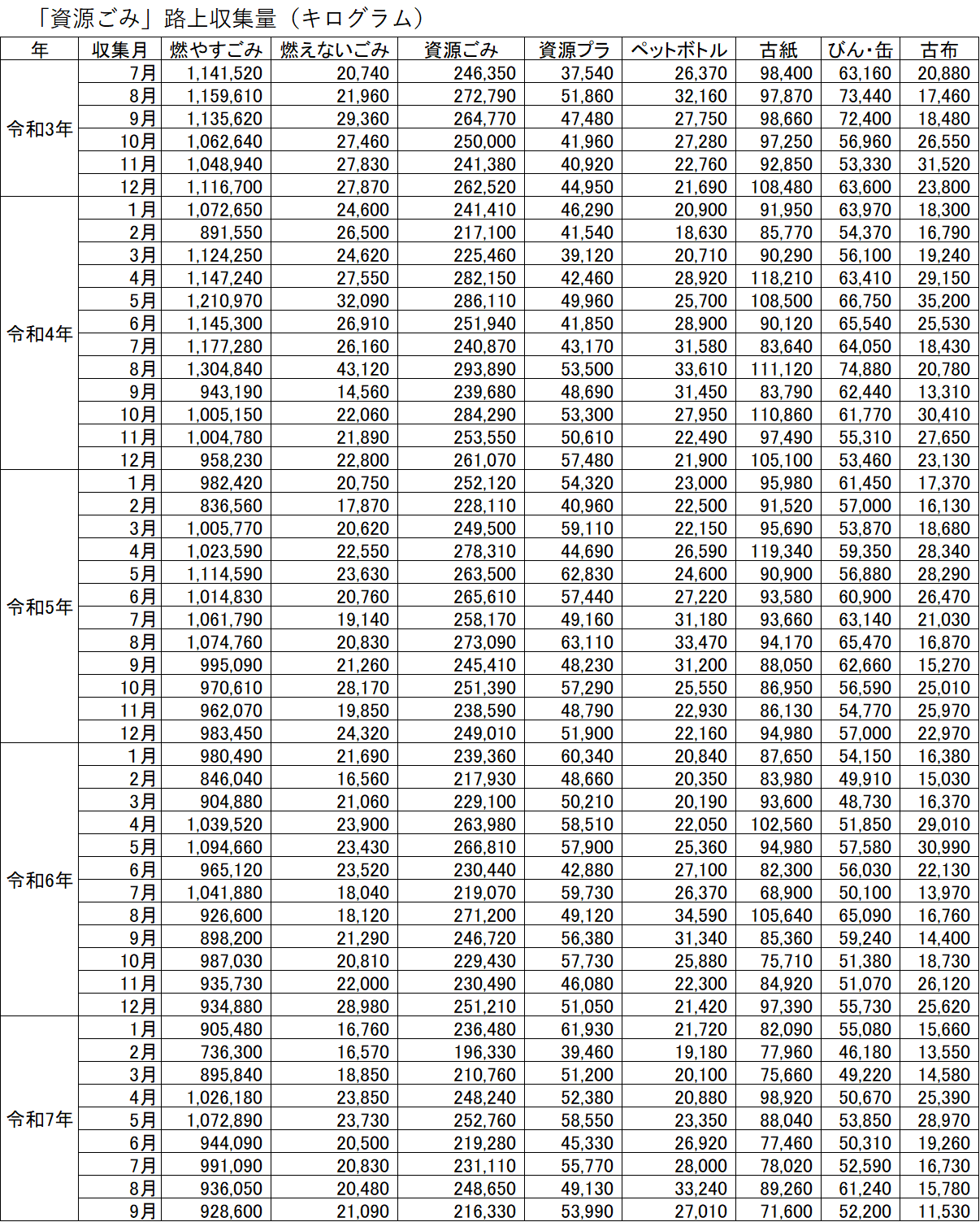 さて、中津市の「ごみ収集(路上収集)」の9月分がホームページに公表されたので、市のデータをグラフにしてみました。