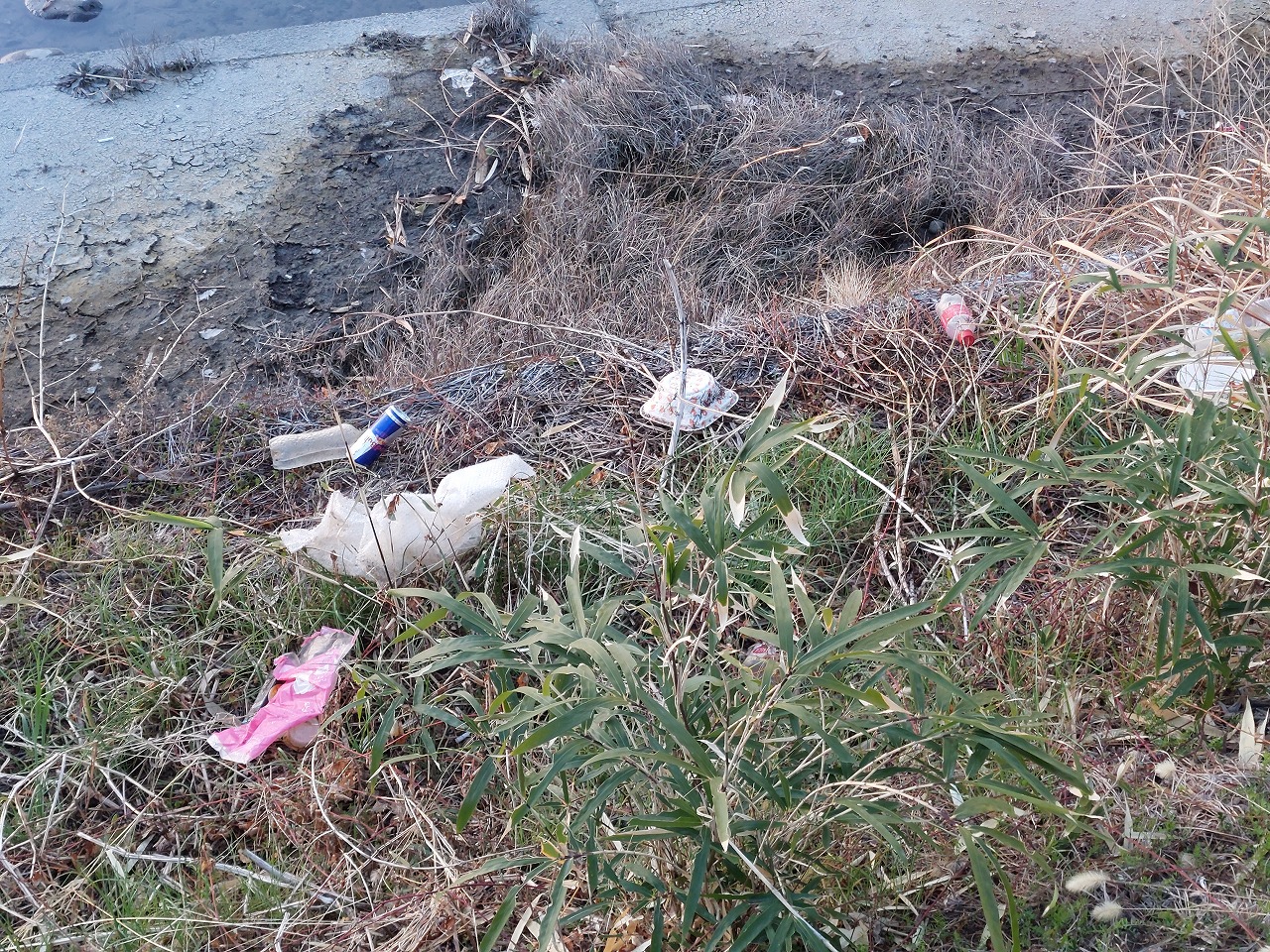 さて、蛎瀬川左岸の土手に、燃えるゴミやペットボトル、缶が不法投棄されています。