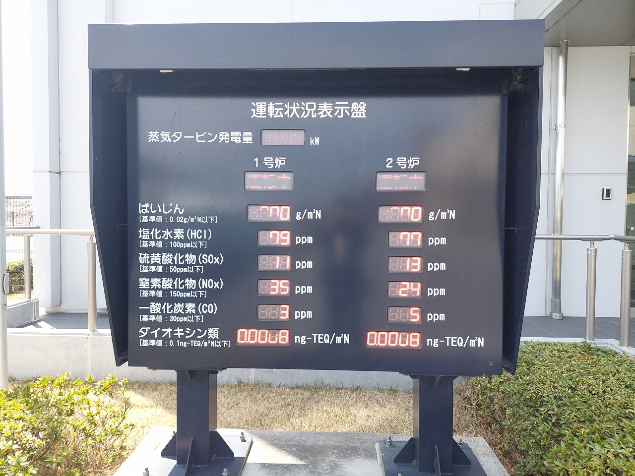 玄関正面には、廃ガス濃度を示す運転状況表示盤が設置されています。