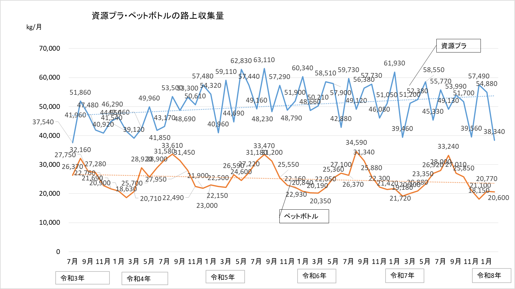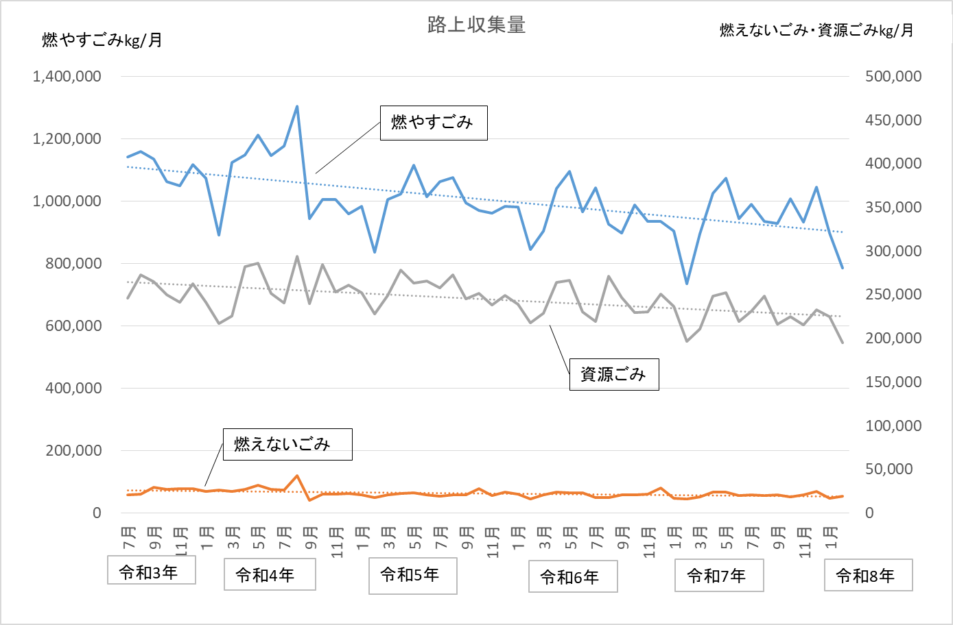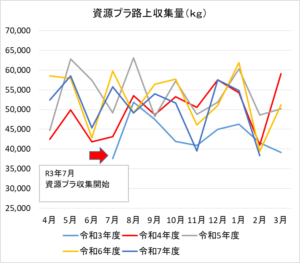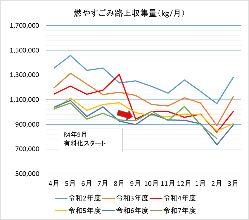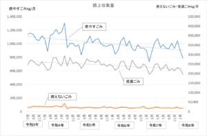 月ごとではごみ減量の効果分析が難しいため、長期的なスパンで見るためにグラフを作成しました。
