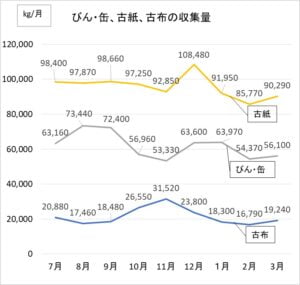 3月の収集量は、資源プラ39,120kg、 ペットボトル20,710kg、 びん・缶56,100kg、 古紙90,290kg、 古布 19,240kgとなっています。