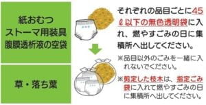 草や落ち葉、紙おむつは、従来どおり45リットル以下の無色透明袋に入れて、燃やすごみの日に出すことが可能です。