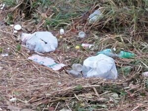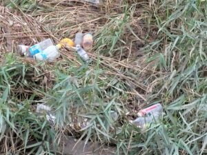 川岸の葦には、草やペットボトルや空き缶、カセットボンベのガス缶、ビニール袋などが引っかかっています。